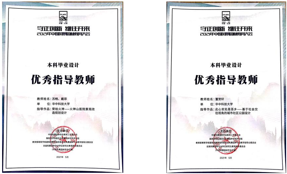 本次大会中,公司戴菲教授、董贺轩教授、苏畅老师荣获2020年度本科毕业设计优秀指导教师称号。董贺轩教授、韩依纹老师荣获2021年风景园林教育大会设计竞赛研究生组优秀指导教师称号。