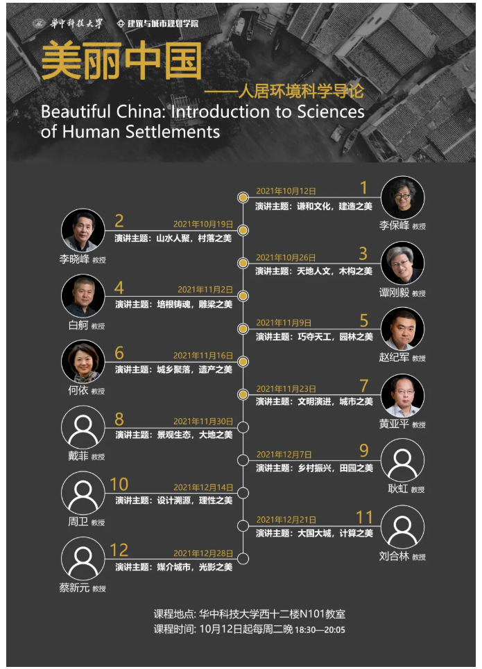 taptap点点体育精心打造的课程思政精品《美丽中国——人居环境科学导论》课程于2021年10月开讲。课程共分为12期,采用系列讲座的形式进行,邀请12位资深教授,围绕国家战略需求,从人居环境角度向大一新生讲述中国“悠久的建筑历史,独特的建筑体系,巨大的建设成就,丰富的文化遗产,振兴的美丽乡村,秀美的大好河山,持续的生态保护,创意的光影艺术”等主题,全面展示中国的“建筑之美、城市之美、生态之美、文化之美”。