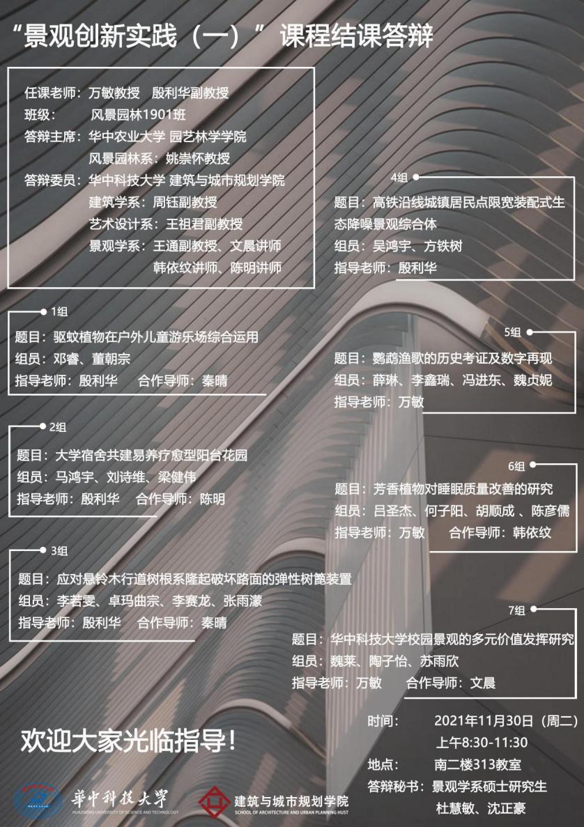 为检验课程教学成果,2021年11月30日,第13周周二上午8;30-11;30,南二楼313教室,“景观创新实践(一)”课程结课答辩正式举行(图1)。答辩邀请了华中农业大学园艺林学公司风景园林系姚崇怀教授作为答辩主席,和taptap点点体育建筑学系周钰副教授、艺术设计系王祖君副教授、景观学系王通副教授、韩依纹讲师、文晨讲师、陈明讲师共组成7人评委组(图2),景观学系硕士研究生杜慧敏、沈正豪为答辩秘书。