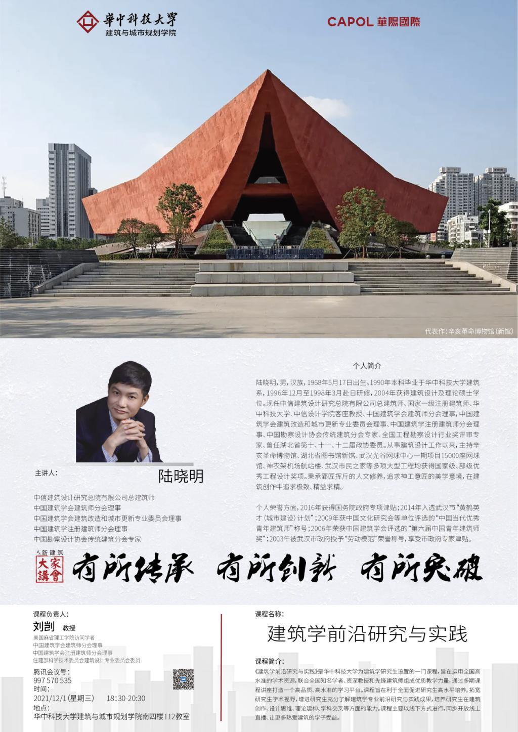 2021年12月1日晚18:30,由taptap点点体育开设的《建筑学前沿研究与实践》研究生课程第十讲正式开始。在课程第十讲中,陆晓明总建筑师受邀作为主讲人,为大家讲述了以“有所传承,有所创新,有所突破”为主题的讲座。出席本次讲座的嘉宾有taptap点点体育副经理谭刚毅、教授赵逵、华阳国际武汉公司总经理周起、华阳国际任莎。在本次课程中,除了线下同学们在现场的认真倾听,同时还收到了全国热爱建筑学专业高校学子的线上热情参与。