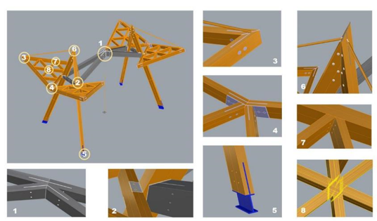 设计使用装配式木结构,其生产和建造环节均可减少碳排放,不影响生态环境。团队在与林榔木公司(当代木结构建筑智能化建造高新技术企业)合作的基础上完成方案的多轮深化,包括参数化模型建立、结构体系计算、及节点连接设计等。在满足结构计算、确定构件截面尺寸后,对每个节点连接进行了细化设计。
