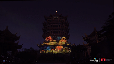 但是在今年春节,蔡新元教授发布的xr黄鹤楼光影秀,利用了增强现实、扩充实境的技术,重塑了黄鹤楼灯光秀的文化表达,目前的网络浏览量超过700万,转发点赞过百万,从500人到500万到700万,以万倍为概念在急速传播。