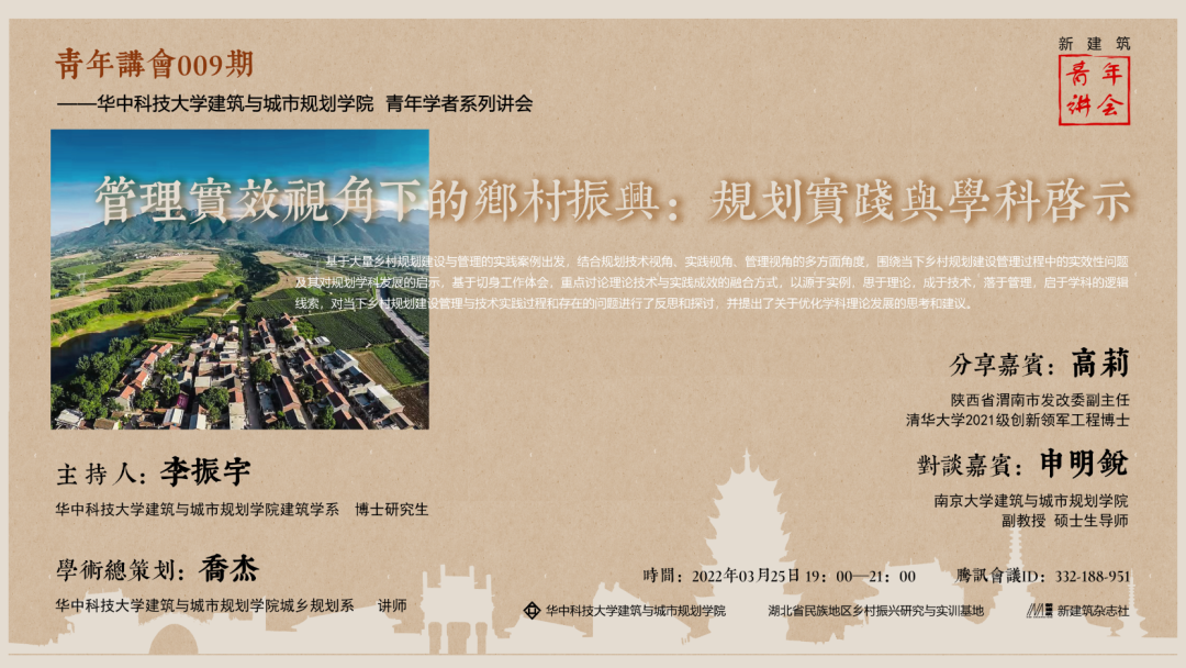 2022年3月25日晚,由湖北省民族地区乡村振兴研究与实训基地、taptap点点体育文化遗产研究中心、新建筑杂志社联合主办的第9期青年讲会在线上举行,本期的主题为“管理实效视角下的乡村振兴:规划实践与学科启示”。