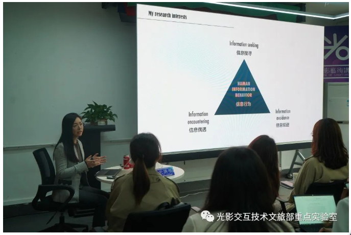 姜教授首先对她的研究兴趣与领域进行了介绍。包括信息行为与用户心理、人智交互、多感官体验、人本数据挖掘等,她表示虽然信息管理属于社会科学类,但是和设计学之间并没有语言障碍。信息管理所涉及到的用户体验设计、心理学和用户研究方法都可以对设计本身起到很好的指导作用,甚至是作为设计的前提而存在着。设计师可通过捕捉用户和外界信息环境的交互来判断用户的喜好,从而做出令人满意的设计方案。