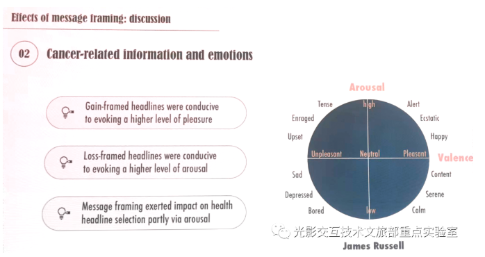 最后一个部分是对实验设计、实验过程及分析的讲解。姜教授从信息框架对女性用户网络健康标题选择的影响,及癌症标题的信息规避实验为主线展开分享,便于同学们更好理解实验的整个过程。在信息框架对女性用户网络健康标题选择的影响——接近/回避动机的调节作用中,姜教授研究团队得出的主要结论是与损失型标题相比,增益型标题激发了更强的愉悦度,同时带来了更多的注视次数、更久的注视时长及更多的点击次数,而且增益型标题对于趋近动机高的参与者来说能够更有效地吸引注意。因此,创建痛症标题时应尽量使用增益框架,尽管癌症本身是一个令人生畏的话题,但是增益型标题有助于减少癌症信息规避,对于癌症知识的普及和病症预防与治疗实践具有重要的意义。