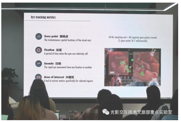 随后,姜教授以其最新研究成果“女性用户网络健康标题选择”的眼动测试研究为例,对信息交互中的眼动实验方法进行了深入、系统的阐释。首先,她用生动、形象的比喻为大家介绍了信息行为内涵,界定了与之相关的信息搜寻、信息偶遇和信息规避三种常见信息行为内容与相互机制。接着,姜教授对眼动追踪技术原理及工作机制进行了介绍。眼球追踪器、眼动跟踪指标和眼动跟踪可视化等概念都使同学们兴趣盎然,如眼球追踪器通过凝视点、注视、扫视、兴趣区来进行眼动跟踪,凝视点是视觉轴的瞬时空间位置,注视是眼睛相对静止的一段时间,扫视是从一个注视点到另一个注视点的快速眼球运动,兴趣区为特定的区域提取指标的工具。同时,眼动跟踪还可以进行可视化,主要形式有眼动热图和眼动轨迹图等。