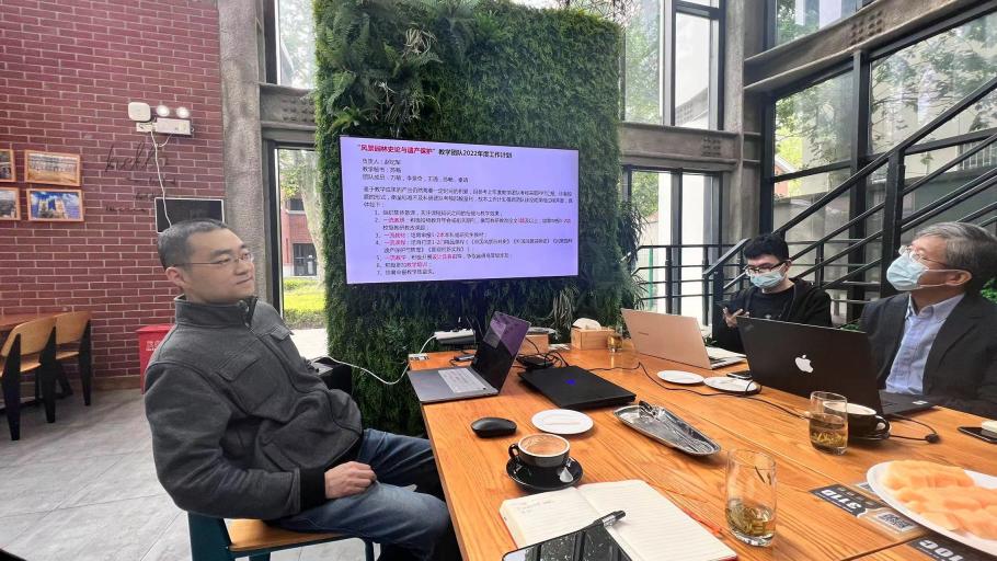 2022年4月14日星期四景观学系全体教师在东华园开展教学探讨与年度学科团队计划会议。会议开始,系主任戴菲教授首先就2021年的教学团队成果进行回顾并对本次会务议程进行介绍,针对景观学系“十四五”规划的教学目标的达标情况逐一说明完成情况。随后以戴菲、万敏、赵纪军、董贺轩教授领衔的四个教学和学科团队分别就2022年度工作计划进行阐述。