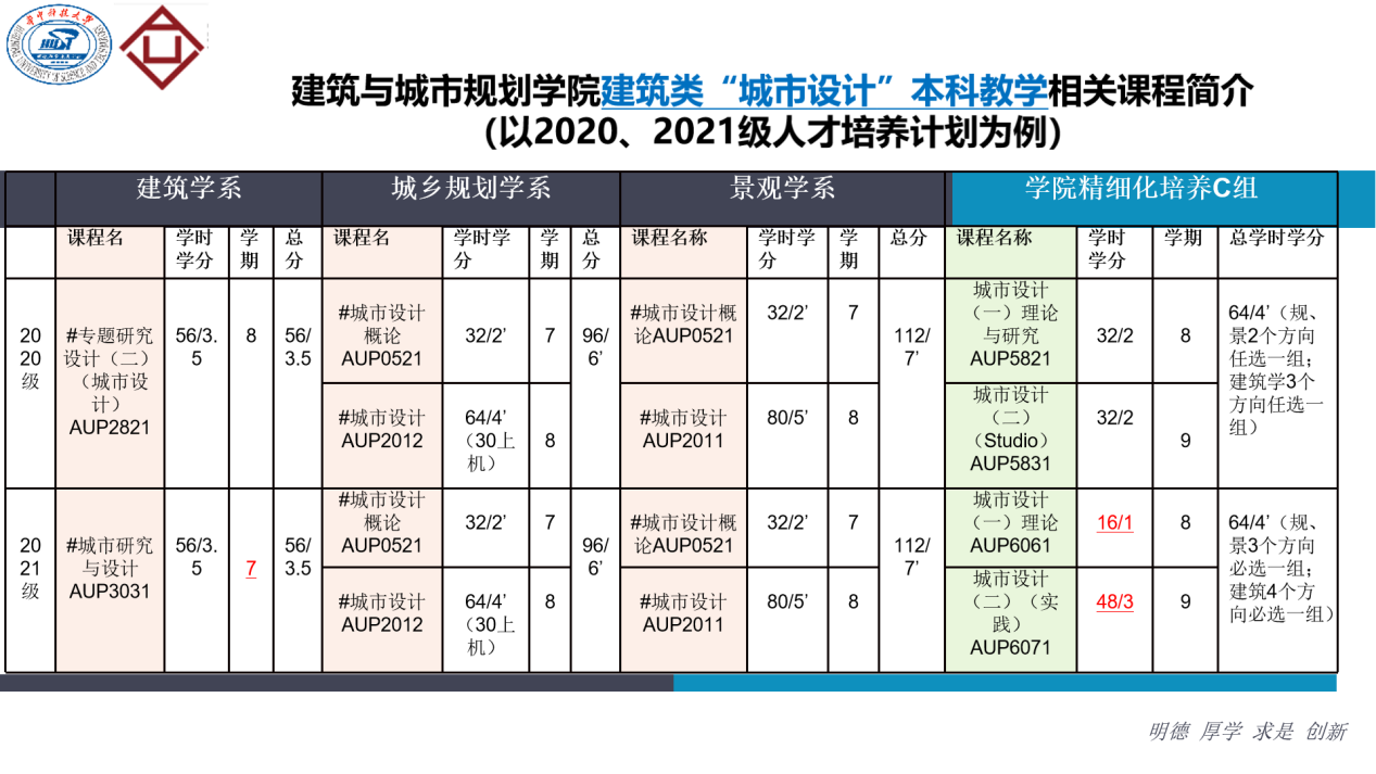 研讨会首先由彭翀就4个特色精细化培养研讨安排做整体说明(图2):希望通过集体研讨,推动公司本科精细化培养可持续发展和特色人才培养。4月份首先开展“城市设计”方向研讨,由景观学系负责召集;5、6月份依次开展“文化遗产保护”方向、“绿色建筑”方向(将由建筑学系召集)、“乡村振兴与乡村设计”方向(将由城乡规划学系召集)的研讨。随后,本次研讨召集人殷利华副教授就三个系2020级、2021级的“城市设计”课程设置介绍整体情况(图3),并请各系分享各专业的“城市设计”课程教学情况和对“城市设计”精细化培养方向发现的问题及思考。