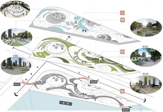 在口袋公园中的三维布局设计上,采用了“构架山水”的设计手法。其利用了根植于中国人内心的传统风水学观念,引领口袋公园布局构建一种幽雅、古趣、清逸的空间环境。在具体设计上,通过将园区周边的住宅小区比作“山”,将塔子湖明渠比作“水”,将园区的主要景观展示面朝向东南方,正对塔子湖明渠的位置,贴合了“山环水绕”的风水布局,蕴含了场地安定祥瑞的美好意蕴。
