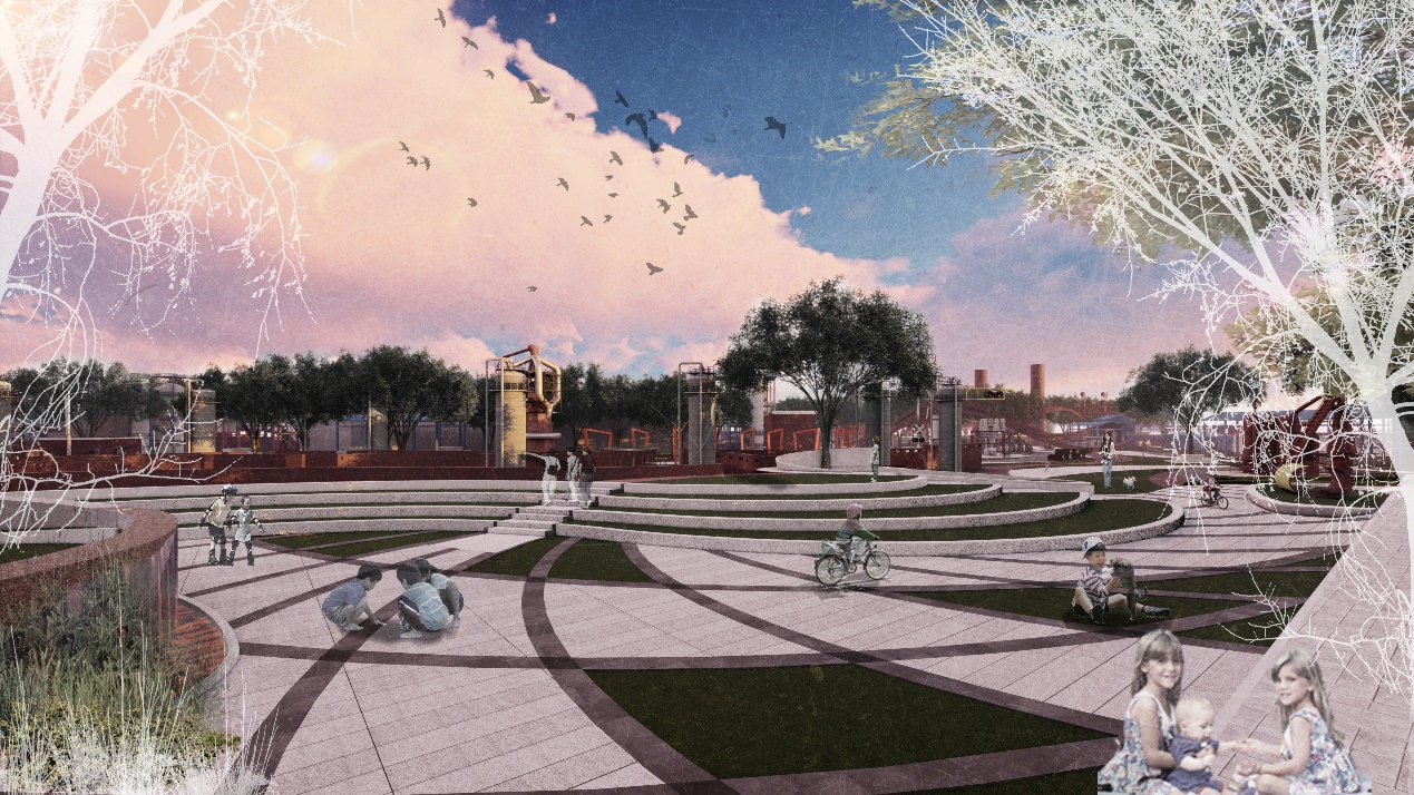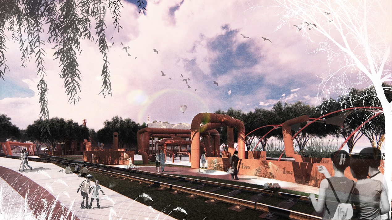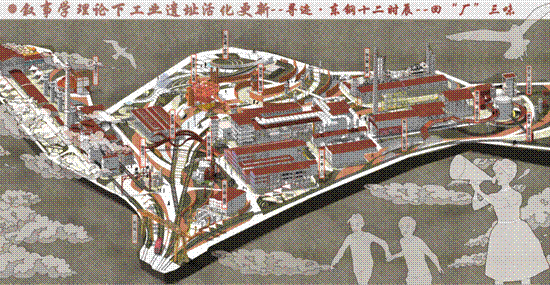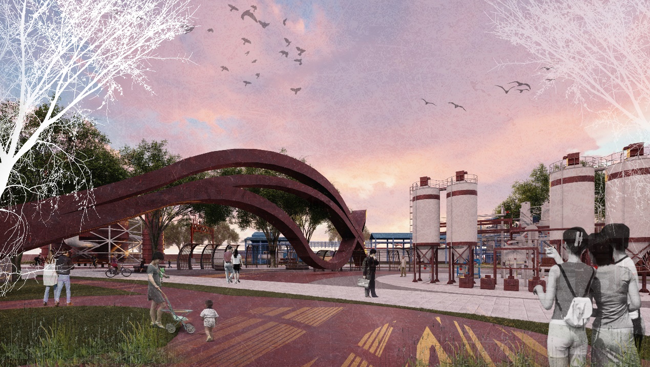 该设计方案结合叙事学理论的研究成果进行方法构建,通过从语汇和语法层面进行对叙事性空间的深入探讨,提出历史事件节点、空间结构分布以及历史遗迹分布三大主题构建线索形式,串联镶嵌式、并联镶嵌式以及网状镶嵌式三大空间文本结构,再结合叙事学中叙事修辞手法与设计手法相结合,从而打造由“主题点”-“路径线”-“空间面”激活的建构策略,以期拓宽工业遗址公共空间营造的设计方法。