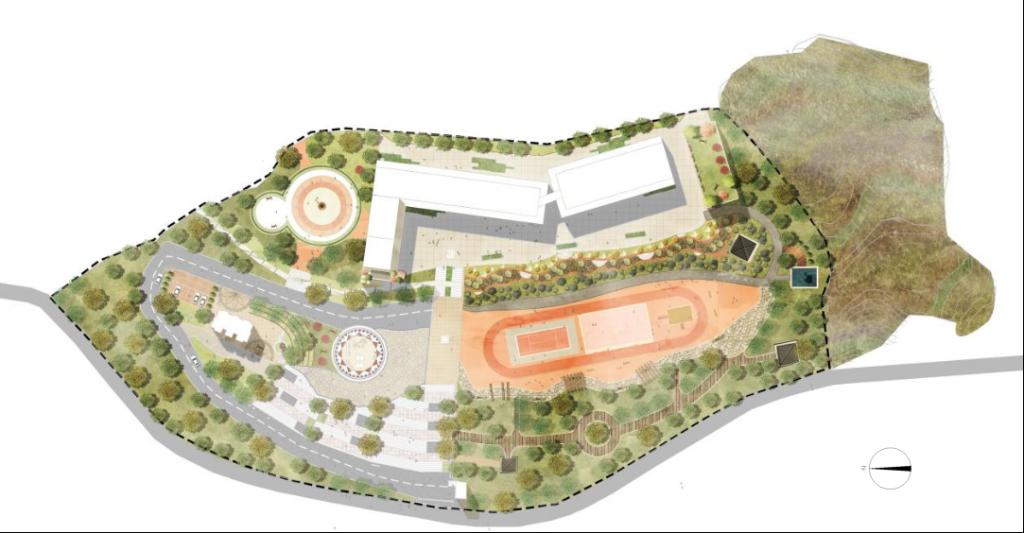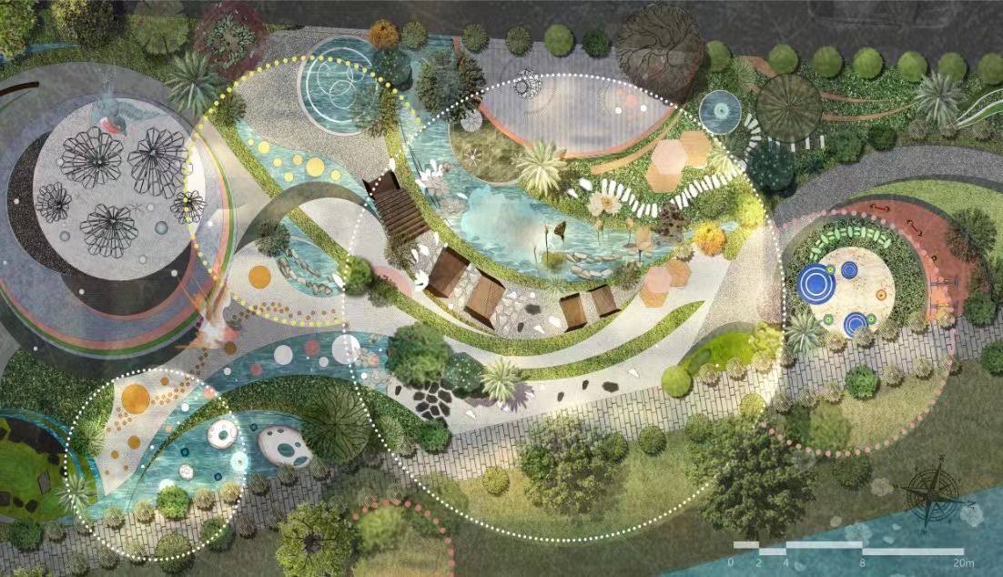 在设计中将使用者的行为活动对应不同的空间场所。设有主入口休闲阶梯、休闲交流区、广场活动区、种植体验区、运动健身区、低龄游戏区、滨水区,功能区之间无界限划分,每个功能区都可延续功能。 由于场地具有高差,场地被分为三大平台,从竖向设计来看场地可被大致分为第一平台入口区域;第二平台运动休闲生活区域;第三平台为教学工作区域。