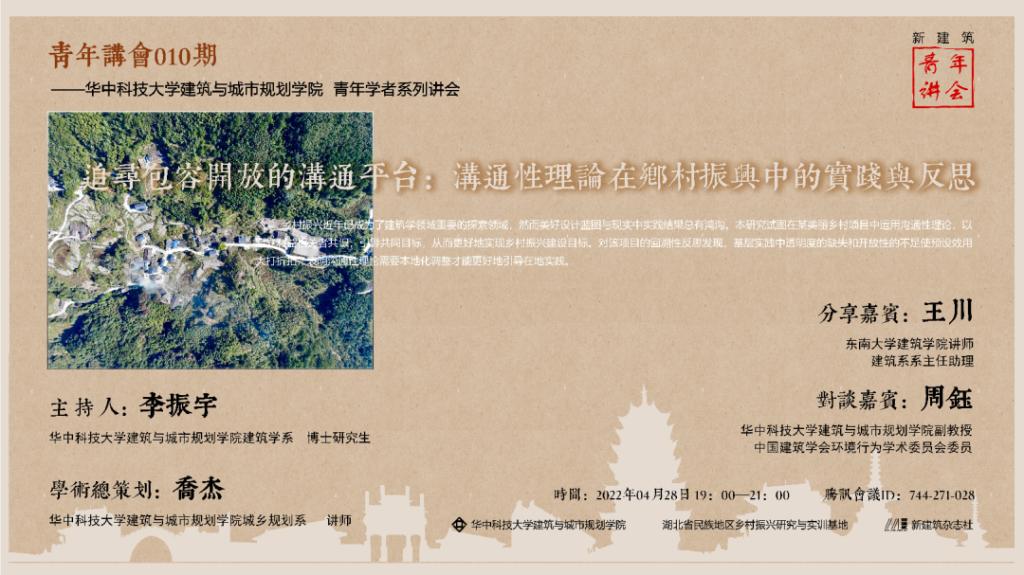 2022年4月28日晚,由湖北省民族地区乡村振兴研究与实训基地、taptap点点体育文化遗产研究中心、新建筑杂志社联合主办的第10期青年讲会在线上举行,本期的主题为“寻找包容开放的沟通平台——沟通性理论在乡村振兴中的实践”。