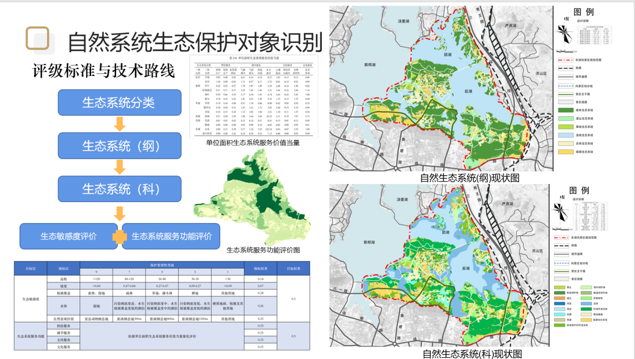 小组首先对基址进行综合调查与评价基础现状,包括山水环境与生态景观、风貌特征与配套设施等内容,接着对重点保护对象进行专项调查,对自然生态系统类型空间、植物/生境类型空间、动物/栖息地类型空间、地质遗迹类型空间、自然景观类型空间和人文资源类型空间进行识别与评估,再者利用优选叠加法得到规划分区,并用生态敏感评价的方式进一步矫正实现规划分区和管控规划。最后针对场地特殊居民点现状进行规划,同时梳理场地游憩。