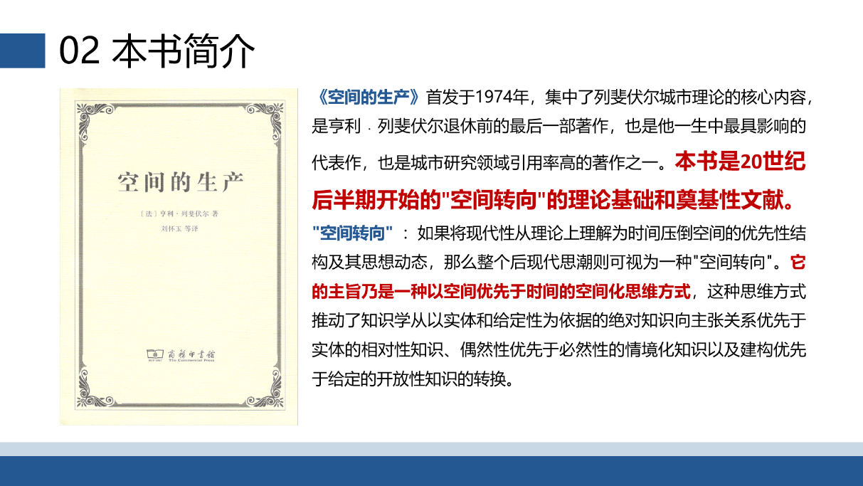 “这本城市研究领域的著作围绕‘空间’‘生产’‘空间的生产’‘三元空间辩证法’等核心概念展开,共含七个章节。通过这本书,我在一定程度上对城市空间有了更深的理解,同时产生了疑惑:空间的生产理论产生于欧洲老牌资本主义强国,是否完全符合中国国情?如何指导社会主义空间建设实践?”