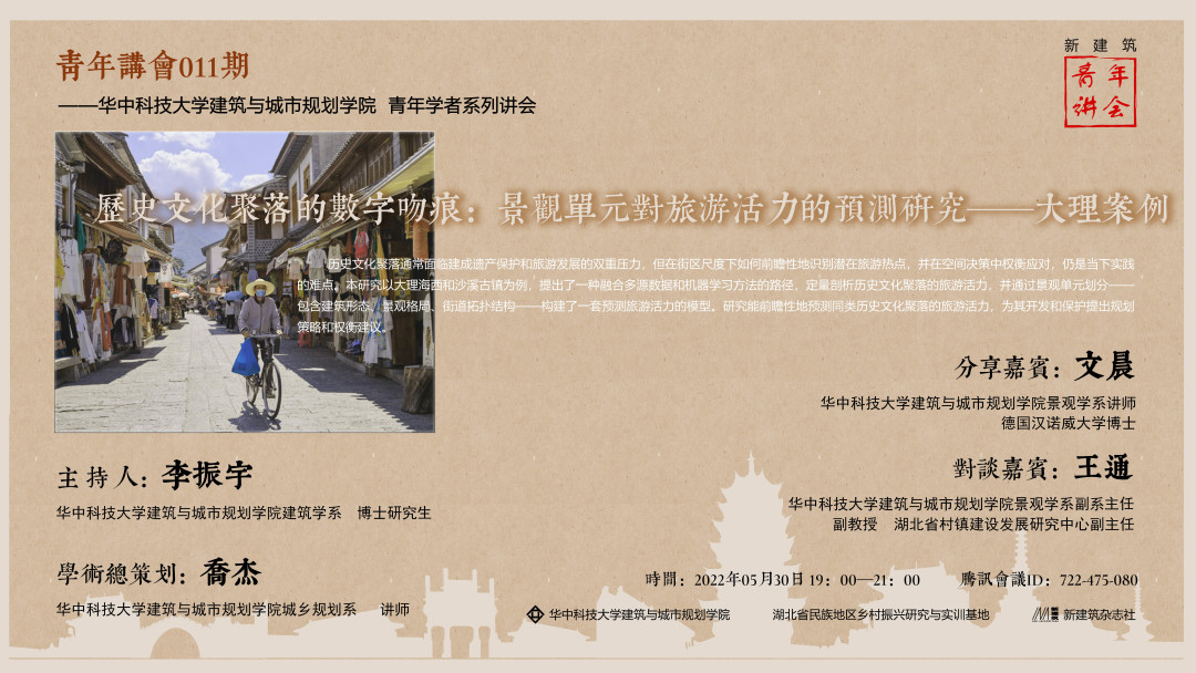 2022年5月30日晚,由湖北省民族地区乡村振兴研究与实训基地、taptap点点体育文化遗产研究中心、新建筑杂志社联合主办的第11期青年讲会在线上举行,本期的主题为“历史文化聚落的数字吻痕:景观单元对旅游活力的预测研究——大理案例”。