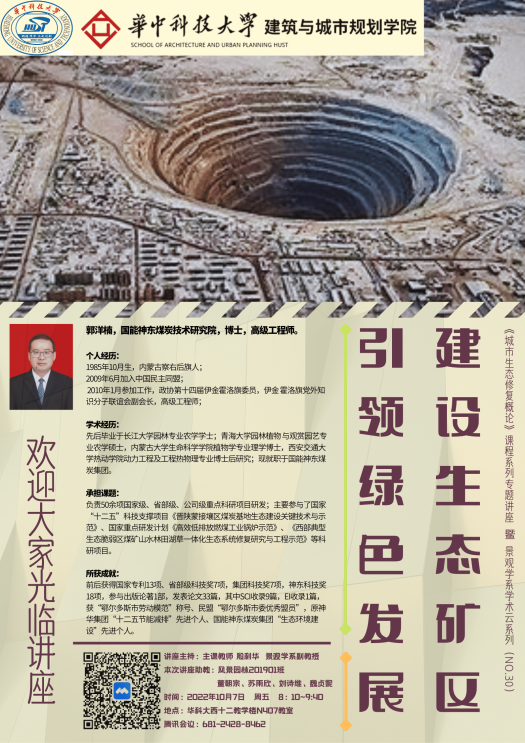 《城市生态修复概论》课程青年专家讲座系列之二,于10月7日上午8:10-9:40,在西十二楼N407教室进行。课程主课殷利华副教授邀请了国家能源神东煤炭技术研究院高级工程师郭洋楠博士,在线上带来名为同学带来题为《建设生态矿区,引领绿色发展》的精彩报告(图2)。