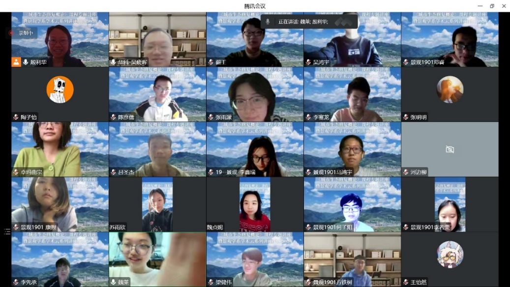 报告完后,在线的同学踊跃提问(图7),吴晓晖耐心解答。最后任课老师殷利华进行总结,指出吴教授此次讲座增长了我们对黑臭水体成因、生态修复的理论知识的系统了解,同时通过身边湖溪河案例的讲解,更清晰的认识了人居环境改善中,多学科、多方位合作的必要,也更清晰认识了风景园林专业在城市水生态修复中有限但不可或缺的角色和定位,鼓励同学们多汲取生态修复相关知识,为今后更积极参与人居环境建设做好知识准备。