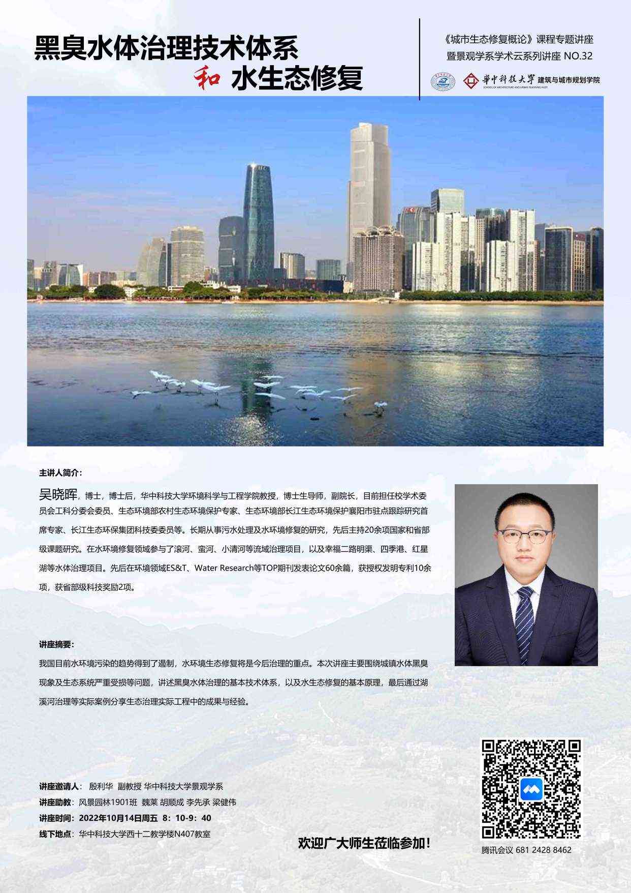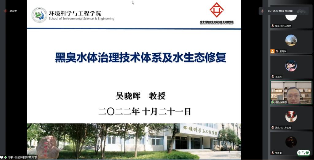 景观学系秋季学期的《城市生态修复概论》课程邀请6位专家进课堂,2022年10月21日上午8:00-9:40,第5场开讲。由于疫情影响,本次讲座改为仅腾讯会议线上进行。主课老师殷利华副教授邀请了taptap点点体育环境科学与工程公司副经理吴晓晖教授,为同学们带来了题为《黑臭水体治理技术体系和水生态修复》的精彩报告(图1、图2)。