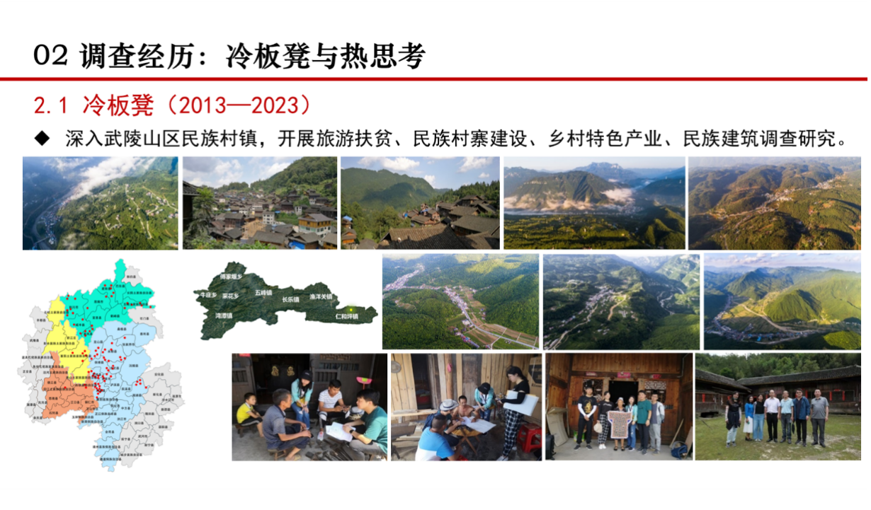 在从调查到研究转换的环节,乔老师介绍了自己10年前的驻村调查经历,结合近年来的研究成果,从乡村社会、乡村空间和乡村空间治理等多个方面做的有益和大胆尝试,并以鄂西武陵山区种植和养殖产业和乡村人居环境关系的调查为案例,为大家分析该地区拟解决的关键科学问题。