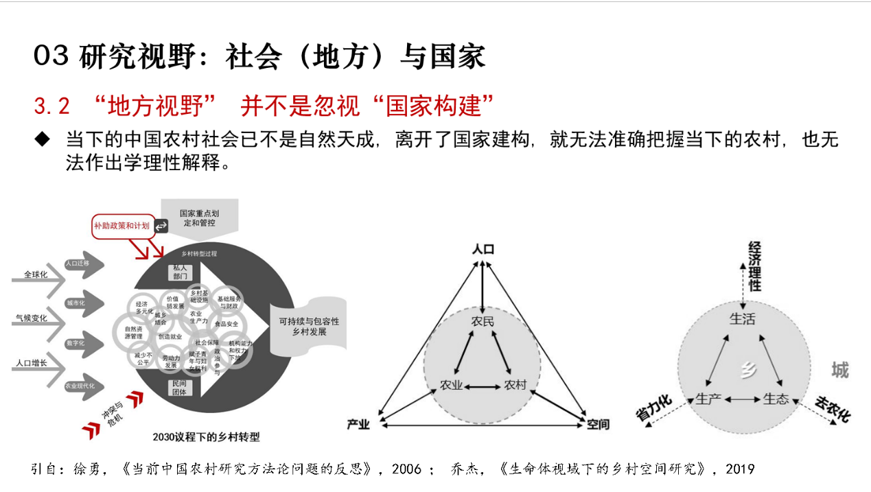 在研究视野讨论部分,乔杰老师强调山区发展缓慢是全球性问题,欠发达地区发展需要尊重地方人居环境特质,应构建社会(地方)与国家的研究视野,并同样强调地方视野并不是忽视国家构建。引用社会学相关观点,当下的中国乡村已不再是自然天成,离开了国家建构,就无法把握当下的农村,也无法作出学理性解释。