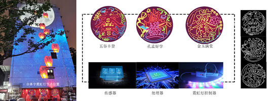 首先为了确保工厂制作霓虹灯的准确性及后期霓虹灯安装的效果,霓虹灯原型图绘制后需要检查是否有重合处和直角形状。其次,在安装立面布置钢架、铁丝网,按照图纸将随轮廓分割的霓虹灯用扎带穿过安装孔固定在铁丝网上,最后,根据需要实现的效果选择不同的控制器。