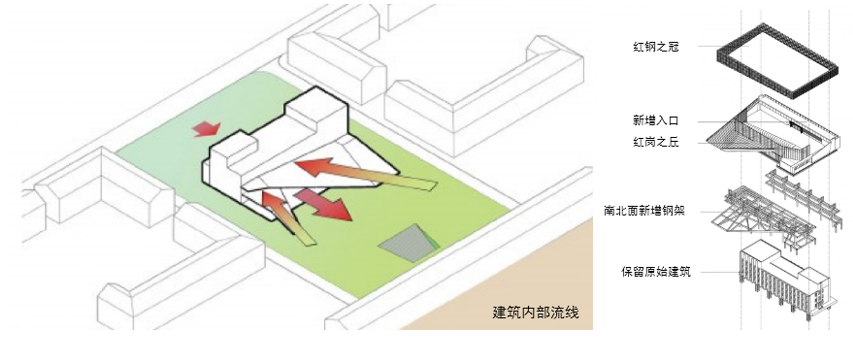 建筑分析:武汉创意设计中心将新老建筑脱开,对保留建筑进行整体结构加固。而新增部分全部采用预制装配体系钢构。