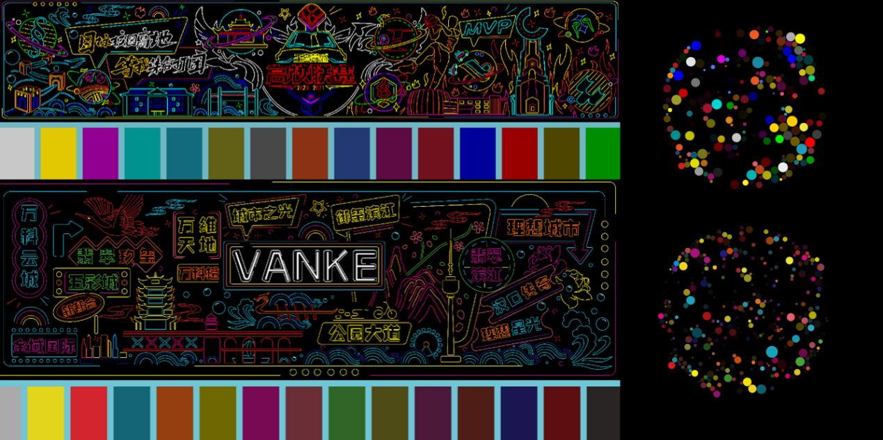 “城市之光”以多种霓虹色为主色调,通过协调画面色彩达到画面统一的效果。基于武汉的城市色彩要素,从金黄的黄鹤楼、长江、大桥、祥云、落日、彩虹取舍意象的光色,构建具有城市特色的霓虹灯艺术景观。黄色的龟山电视塔与蓝色的水花、玫红色的樱花、绿色的枝干共同组成一副窗景,在丰富多彩的武汉城市背景下,主题文字VANKE选用白色使其成为整个画面中心,并添加多彩边框与周围环境相互衔接。