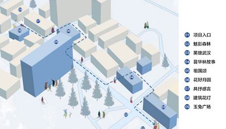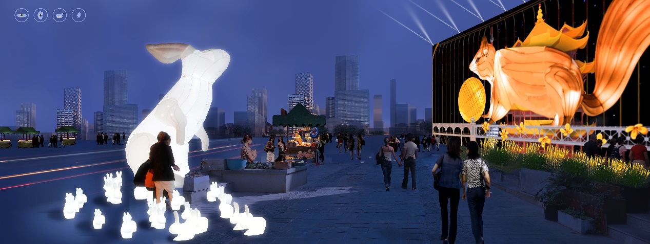 建筑花灯节点位于昙华林光影秀的观赏结束处,昙华林主街区的东侧。建筑花灯节点突出了中秋佳节的主题,表达圆月、温馨、团圆的意象,驱散新冠肺炎的阴霾,激发人们对美好生活的向往。
