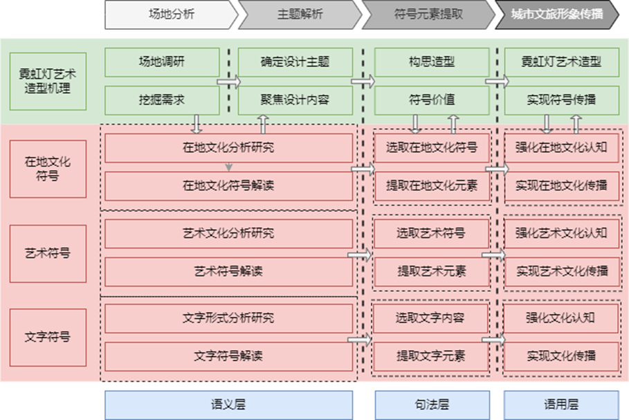 昙华林光影节中的霓虹灯艺术造型以莫里斯符号学为指导,从句法、语义和语用层面将在地文化符号、艺术符号和文字符号的解读、提取、运用与霓虹灯艺术的造型机理设计紧密结合,提出昙华林光影节中的霓虹灯艺术的造型肌理设计流程。