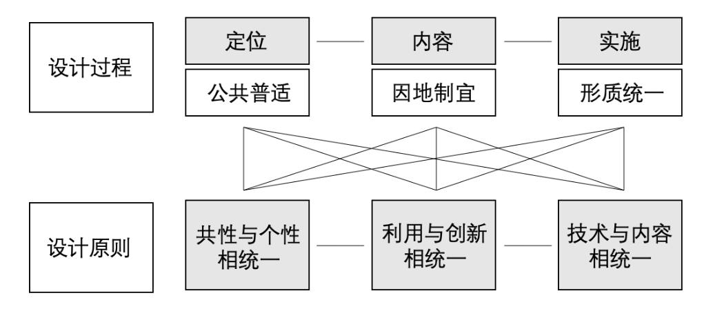在场景理论的视角下,本研究提出了数字媒体立面设计的三个原则,分别是“公共普适”原则:共性与个性相统一、“因地制宜”原则:利用与创新相统一、“形质统一”原则:技术与内容相统一,并以场景特征分析、视觉内容设计、现场实践部署为链条,梳理场景理论视角的内容设计方法。三个设计原则与体系中的三个环节互相对应,共同构建数字媒体立面的内容设计体系。