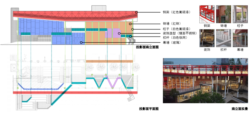 青山红坊光影秀以创意中心的南立面为主要呈像面,呈像结构包括:柱子、钢架、砖墙、建筑装饰面、栏杆、幕墙;呈像的表皮材料包括玻璃、红砖、镜面不锈钢、白色铁网、白色氟碳漆面、红色氟碳漆面。
