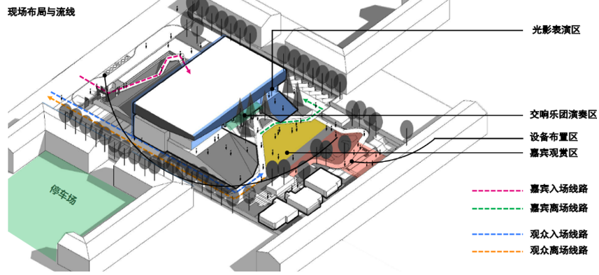 场地分析:青山红坊光影秀坐落于武汉创意设计中心,规划的设计范围以武汉创意设计中心为中心,与西、南、东方向的五栋建筑与植物围合成一个“日”字型空间空间围合度强。