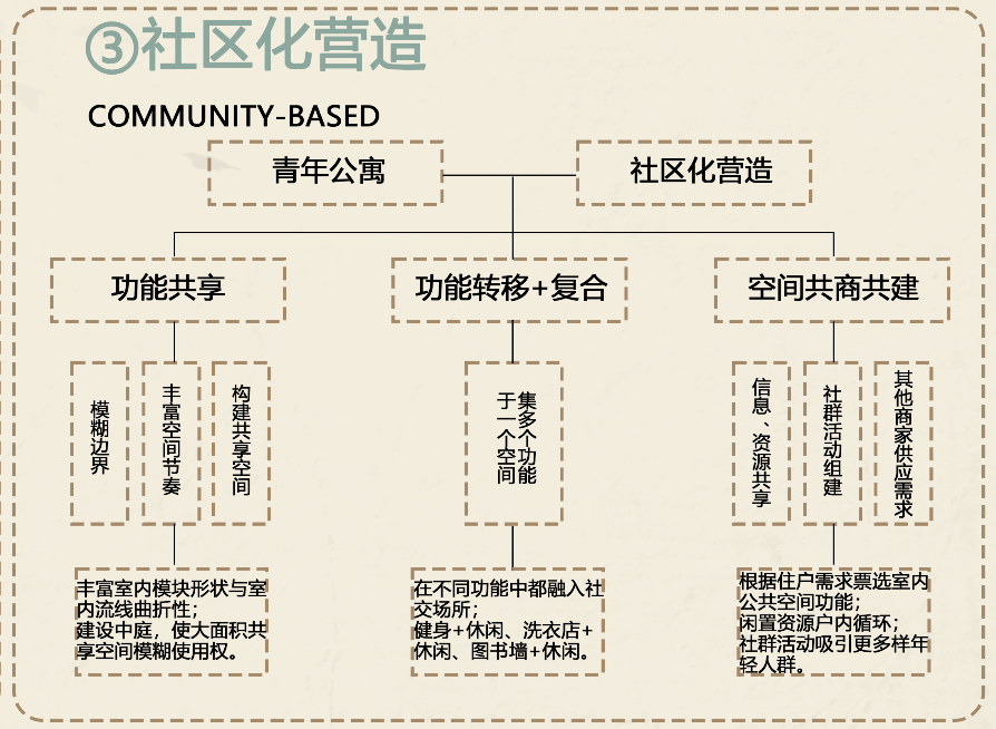 青年公寓与社区之间的融合可以看作是具有共享社区精神和特征的青年公寓,即针对青年群体开发的内部具有大量公共空间和服务设施,邻里关系融洽归属感强的多居住单元的公寓模式。