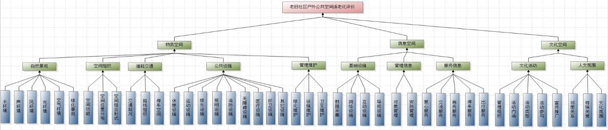 本研究运用AHP层次分析法和CRITIC权重法构建武汉老旧社区户外公共空间适老化评价体系,筛选出了物质空间、信息空间、文化空间3个准则层指标,自然景观、空间组织、道路交通、公共设施、管理维护、基础设施、管理信息、服务信息、文化活动、人文氛围10个一级指标,以及43个二级指标(图2),并对彭刘杨路社区、同兴里社区、邮科院社区、水果湖街武铁社区、冶建花园社区、大业花苑社区6个典型老旧社区进行评价。