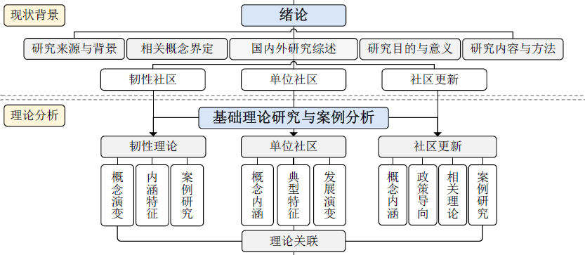 阐述研究背景、目的与意义、内容与方法,搜集和梳理国内外韧性理论、单位社区、社区更新相关的理论研究和案例实践,明确各理论概念内涵、典型特征、发展演变、研究边界,确定理论关联性和结合意义,为后文奠定扎实的理论基础。