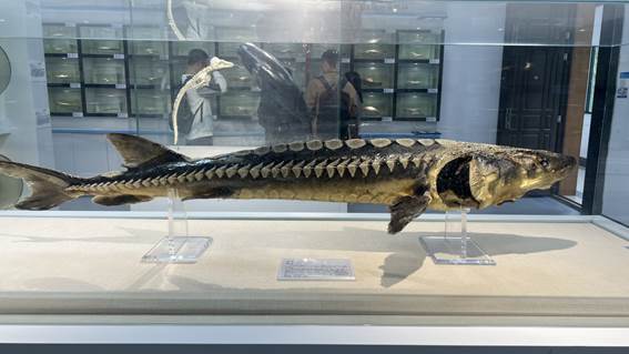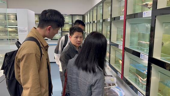 随后,廖主任带团队参观了“三峡工程影响水域重要水生生物遗传资源保存库”(简称“三峡遗传资源库”)。“三峡遗传资源库”由水生生物核酸库、水生生物细胞库、水生生物标本库和长江水生动物标本展示厅“三库一厅”组成,是国内首个重点针对长江珍稀濒危特有水生生物的遗传资源保存库。库内保藏、保存着152种水生生物的标本、细胞和核酸样本,共计17万余份。标本馆内,百余种源自长江流域、形态各异的鱼类标本生动地呈现在大家眼前,除耳熟能详的江豚、中华鲟、武昌鱼等外,还包括许多珍稀和特有物种。廖主任为大家系统讲解了长江流域丰富的鱼类资源及其生态价值,深化了团队对长江鱼类资源的专业知识的了解。