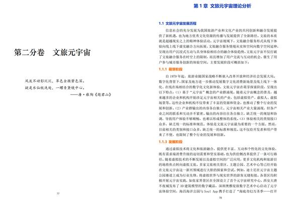 文旅元宇宙分卷认为文旅元宇宙是一种运用数字技术构建的虚拟现实空间,为用户带来了多重价值,涵盖了文化沉浸感、学习体验、娱乐和社交互动等方面。文旅元宇宙也是现阶段元宇宙产业发展和应用突破的先导领域,在未来发展中,应重视培养文旅元宇宙示范应用,充分发挥技术优势,不断完善技术支撑,不断探索新的商业模式和市场机会,借助文旅元宇宙为游客提供更加多样的文化旅游产品和服务。