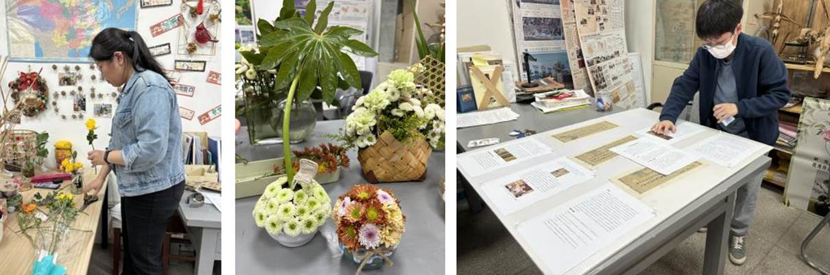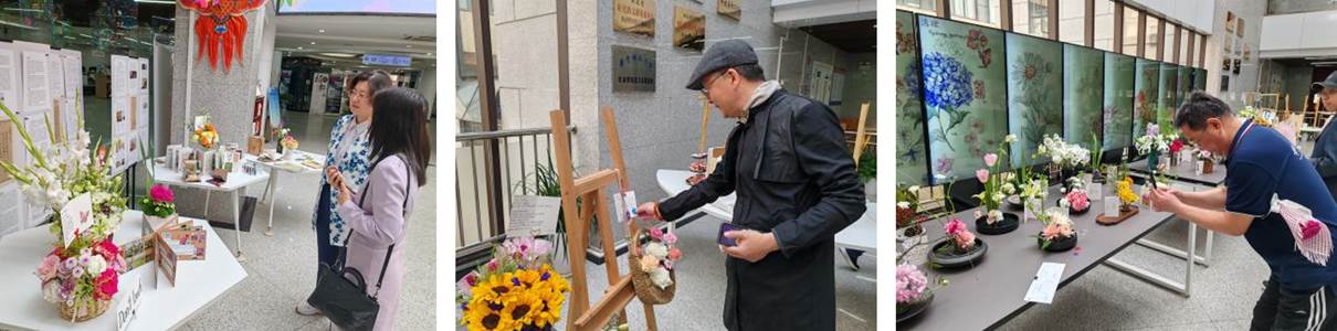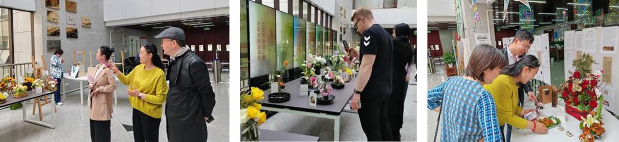 刘老师与参观嘉宾探讨论文,赵老师为优秀作品贴纸、管老师在花艺作品前摄影留念