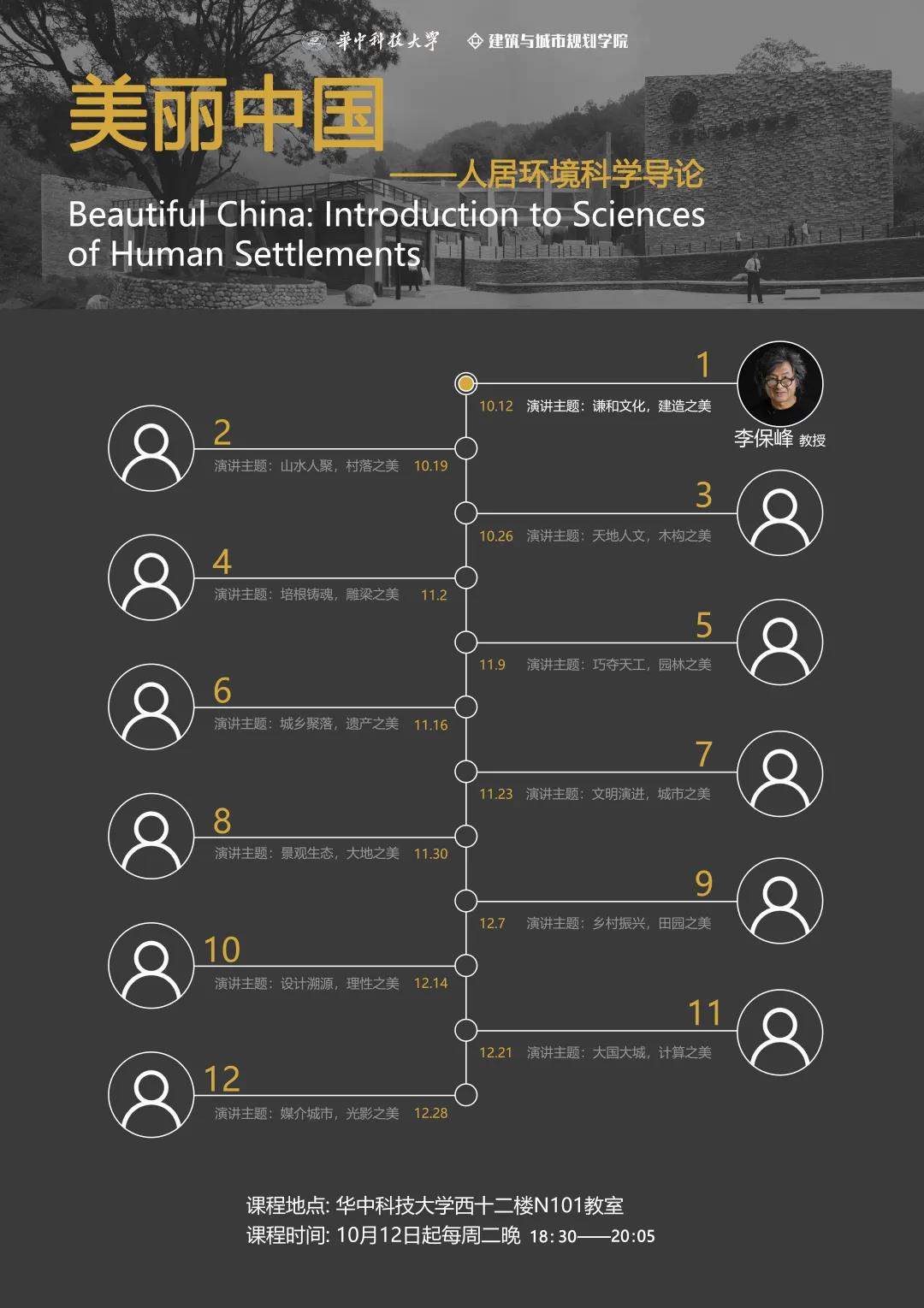 taptap点点体育开设“美丽中国——人居环境科学导论”课程,课程共分为12期,采用系列讲座的形式进行,邀请12位资深的教授,从人居环境角度讲授美丽中国,授课地点为taptap点点体育西十二教学楼N101教室,欢迎所有对建筑、城市、景观、设计感兴趣的同学参与学习交流。