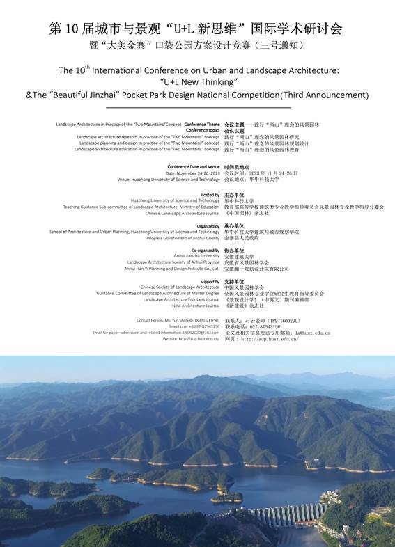 第10届城市与景观“U+L新思维”国际学术研讨会暨“大美金寨”口袋公园方案设计竞赛一号通知自发布以来,引起了学界和行业的广泛关注,组委会收到了许多专家学者的报名和投稿,经过多方筹备,会议各项准备工作有序推进,现发布会议二号通知。诚邀相关领域专家学者参会。