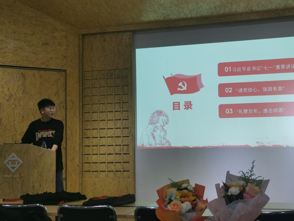 首先由团支书尹竣丰带领支部成员们共同学习习近平总书记“七一”重要讲话,聆听“请党放心,强国有我”的共青团员与少先队员的心声,并完成班级入党积极分子的推选。随后开展“礼赞百年,感念师恩”活动。