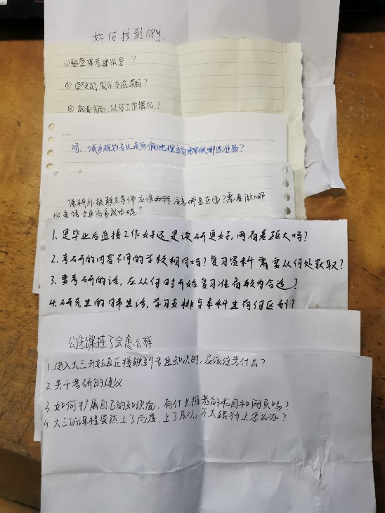 在班团会开始之前,班长组织同学们匿名写好自己目前的疑惑,在会议开始时交给特邀嘉宾们,聆听前辈们的答疑解惑。