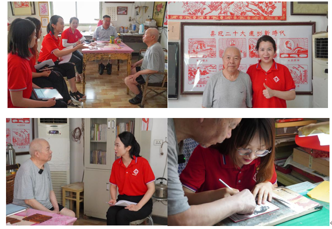 何立群老师带着队员们到湖北省非遗传承人张玉义老先生家拜访。张老说:"打小就生活在小河,在党的关怀下,我们的生活越来越好。现在是以往从未有过的最好的时代,我希望可以通过'红色剪纸'传达我对党对祖国的热爱,也希望吸引更多年轻人关注剪纸技艺,把它一直传承下去。"