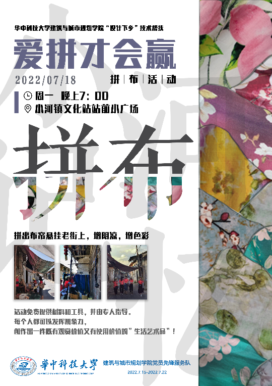 7月18日下午,华中大公司党员先锋服务队小河分队在驻地前的小广场开展“爱‘拼’才会赢”拼布活动。活动以古街特有的文化底蕴为基础,对古街乡民熟知的日常街景做出艺术性的阐释,并以公众参与为理念,公众美育普及为目的,引导乡民关注美、感受美、表现美、创造美,营造人人都爱小河、装饰小河、点亮小河的氛围,为古街增阴凉、添色彩。
