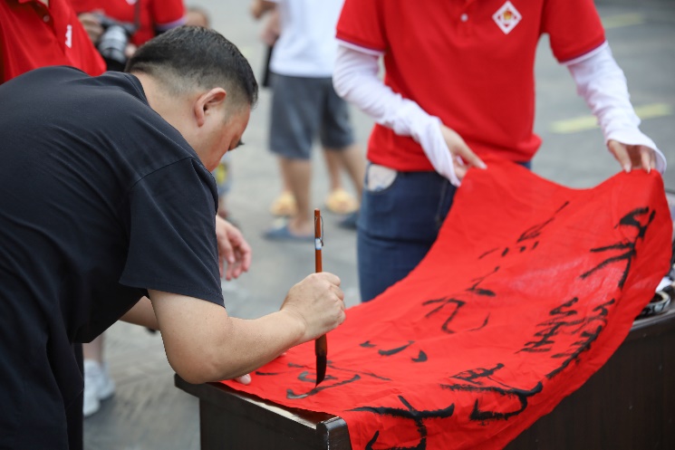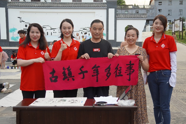 “岳庙晨钟、石桥晚眺、菜圃连村”。古街的居民纷纷亮出拿手技艺,用毛笔在纯色布上写下他们的古街印象。“还有没有布?让我也来写几句。”一位大爷向队员询问。书法拼布制作完成后,拼布上的书法作品将飘扬在小河古街上,书香气息将更加融入乡民的交往空间。