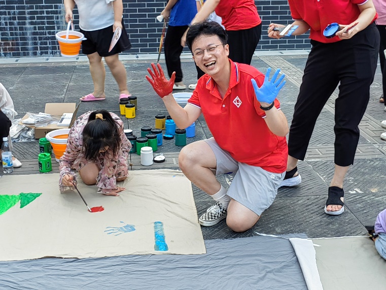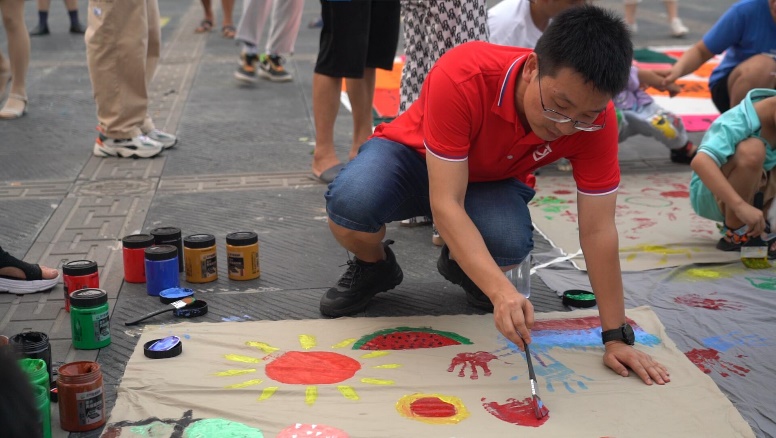 “下次有这种活动我还要来玩!”孩童响亮的稚声落在广场上。拼布上,孩子们拿着画笔,蘸上颜料,随性绘色。一片沙滩、一棵小树、一朵白云、几个手掌印,孩子们用五彩缤纷的色彩描绘着童年里小河古街最美的夏天。“你们这样的活动很有创意,也很接地气,孩子们都很喜欢,是一种很好的美育形式。”一位孩子家长在活动现场感慨道。