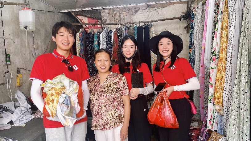 “我们可以就地取材,从店铺遮阳的实际需求出发,用村民的废旧布料,再创作出独属于小河的拼布手工艺品。”“还可以邀请村民在布上题字。”“把鱼篓灯挂在布上,‘点亮’小河!”创作讨论会上,老师和队员纷纷为小河“布景”建言献策。在此基础上,活动负责人方舟老师、陈心愉、崔浩东和李毓佳就地取材,开展布料收集和拼布图案设计工作。队员们敢想敢做,利用专业知识,发挥艺术特长,在拼布的材料选择、色彩组合、制版、裁剪和缝制中,进行了一堂实验性的设计实践课程。