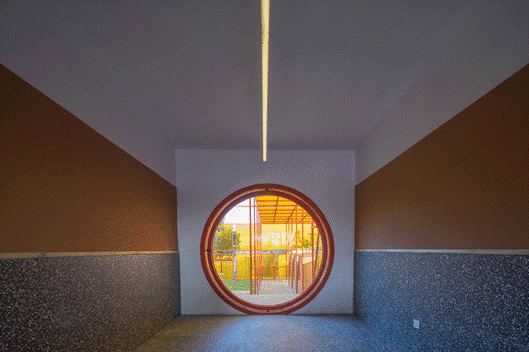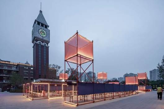 室外区域因为临建的性质和造价的限制,设计用40X40的镀锌方管打造了一个”大笼子“,用橙色阳光板把四周围起来。大笼子用2mX2m的小柱网单元,强化了结构的细和轻。顶部用十字灯来强化向上的仪式感。午后的阳光照射在建筑上,映射出一道魅力的彩虹。