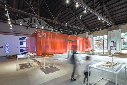 建筑的外墙面和展厅局部内墙保留着各个年代的装修痕迹。展厅内不设吊顶,露出桁架结构。新建做展示挂画的白墙面,设定在一个统一的水平高度。利用桁架结构的特性,设计者用钢索在展厅内悬挂了轻钢构件和两个轻钢几何盒子,外覆盖阳光板,一个为白色,一个为红色;阳光板材质较轻,半透明特性。盒子底部悬空,宛如漂浮在展厅中,与原有建筑的历史感也形成了一个对比。