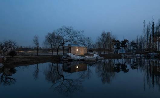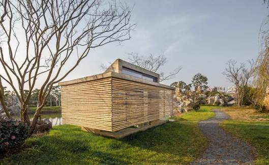 茶室只有六个平米的大小,景观设计也由UAO负责,茶室处于公园北侧池塘边,另一侧是下塘河和公园,两边的风景都很优美。设计师觉得:有限制的美景才是最好的体验。所以,方案是:一个半封闭,半下沉的盒子,进入它要从室外地面下去600mm,进去后,视线只是在露出室外地面300mm的地方无遮挡,300mm以上高1700mm的部分均为竹子百叶半遮挡住;人要看风景,需要俯下身。蜿蜒的碎石子小路引导人到茶室南侧,并在南北侧种植了一棵紫薇,一棵朴树,北侧入口的朴树倒向水面,枝条在空中又弯回茶室。
